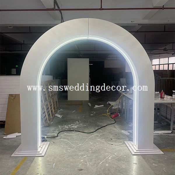 1. Denne bue er lavet af højkvalitets PVC og akryl, meget stabil og har en størrelse på 8ft*8ft. Farven og størrelsen på buen samt farven og størrelsen på den matchende lysstrimmel kan tilpasses.
